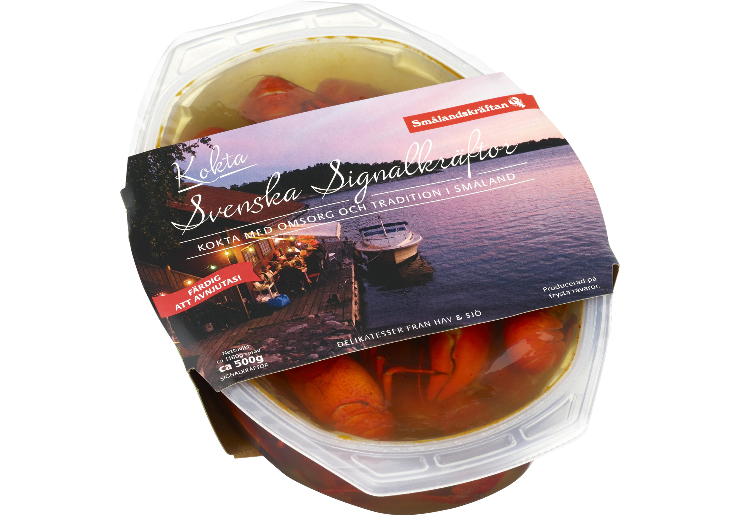 I formen har vi lagt svenska signalkräftor, fyllt på med vatten, krondill, salt och socker efter ett gammalt småländskt recept. Sedan har formen förslutits med en plastfilm med ventil. Genom den lilla ventilen släpps syret ut och vi har en fantastisk produkt som har behållit sin färskhet och sitt näringsinnehåll, dessutom med en längre hållbarhet. Våra svenska signalkräftor kommer från Vänern, Vättern och svenska vattendrag. Färdiga att servera!